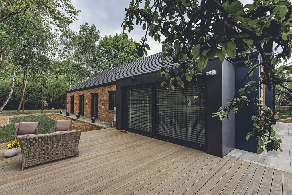 Panoramiczne okno przesuwne typu HS otwiera strefę dzienną na ogród i zapewnia maksymalny dopływ naturalnego światła. Duże przeszklenie wzmacnia poczucie przestrzeni i podkreśla nowoczesny charakter projektu, zachowując jednocześnie spójność z tradycyjną technologią budowy.