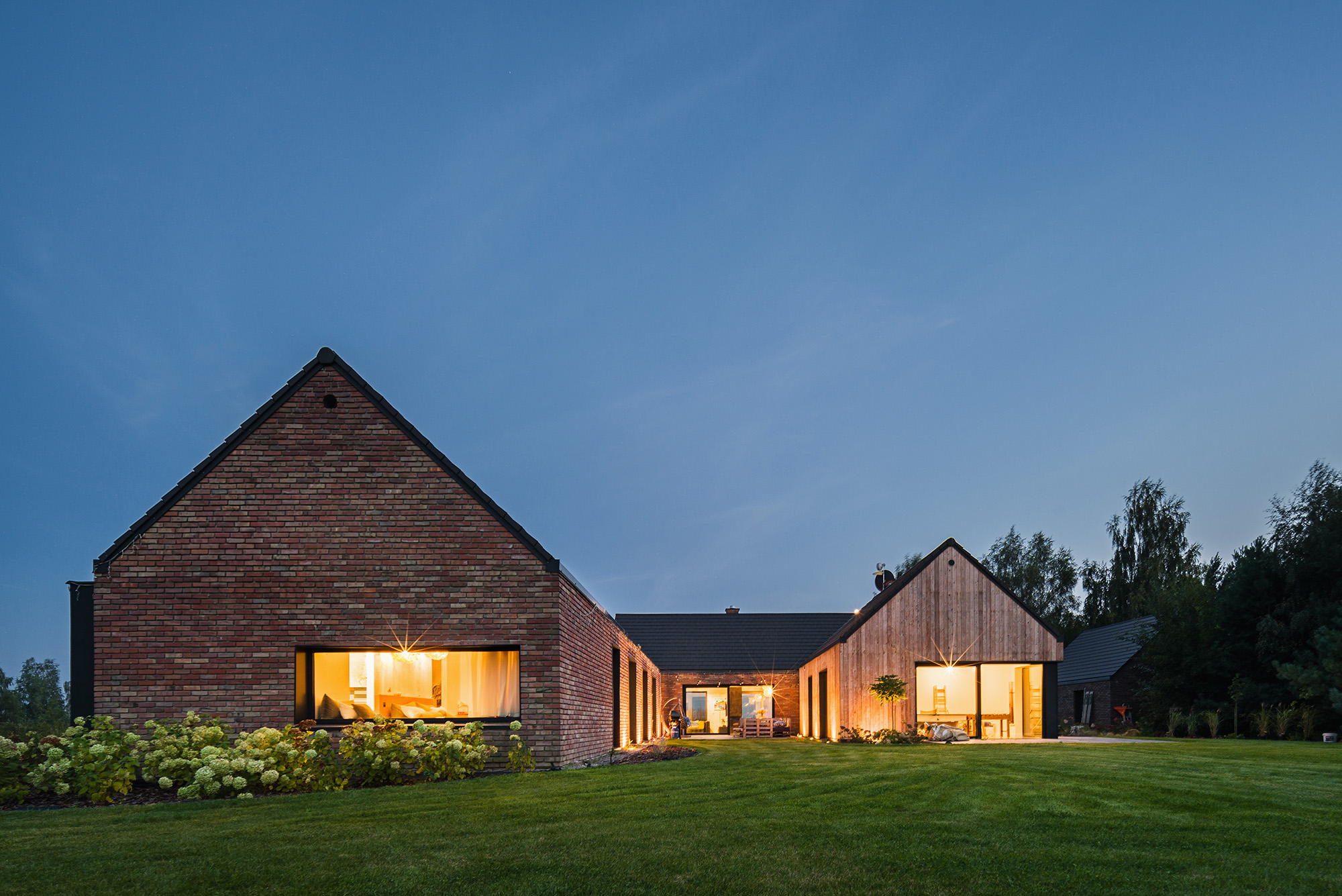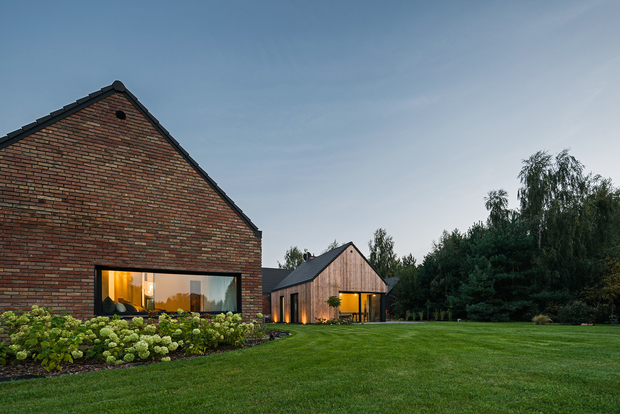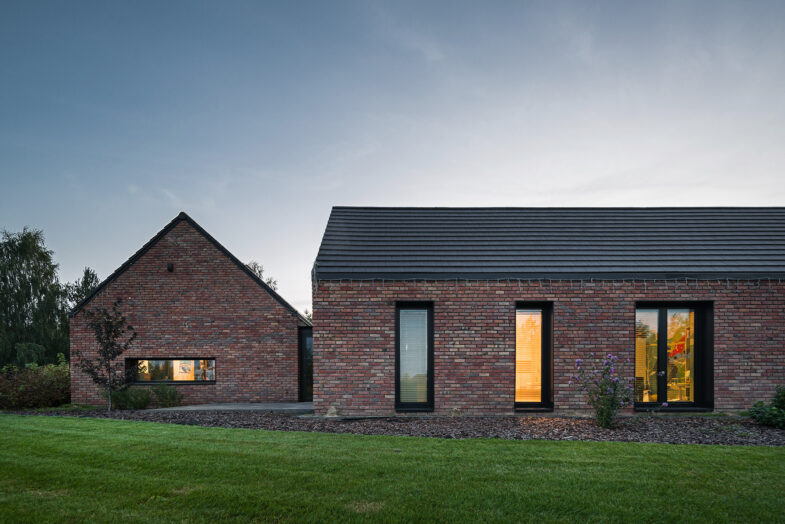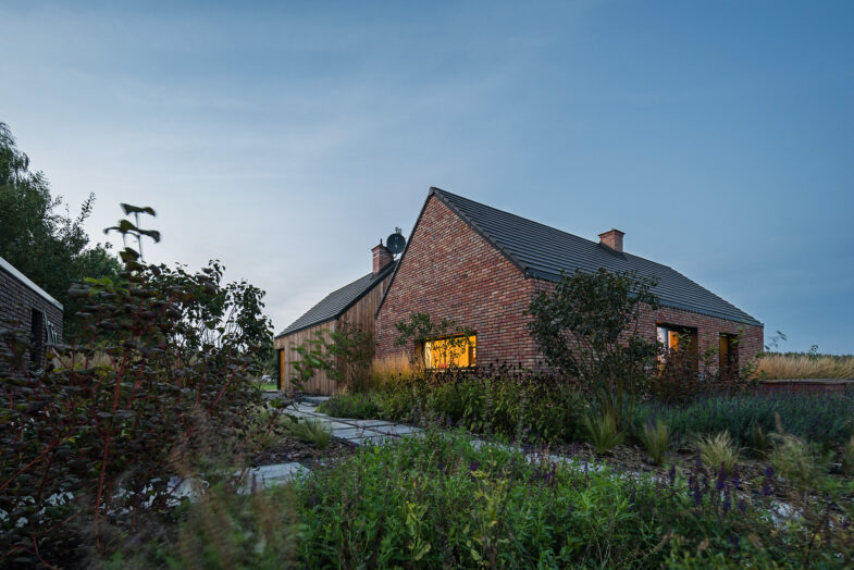 Dom, który prezentujemy powstał w miejscu starego siedliska, po którym zachowały się budynki gospodarcze i domek letniskowy. Na miejscu zastaliśmy zabudowania z czerwonej cegły, drewnianą stodołę i piękne, okazałe drzewa, nie mogliśmy sobie wymarzyć lepszej scenerii.